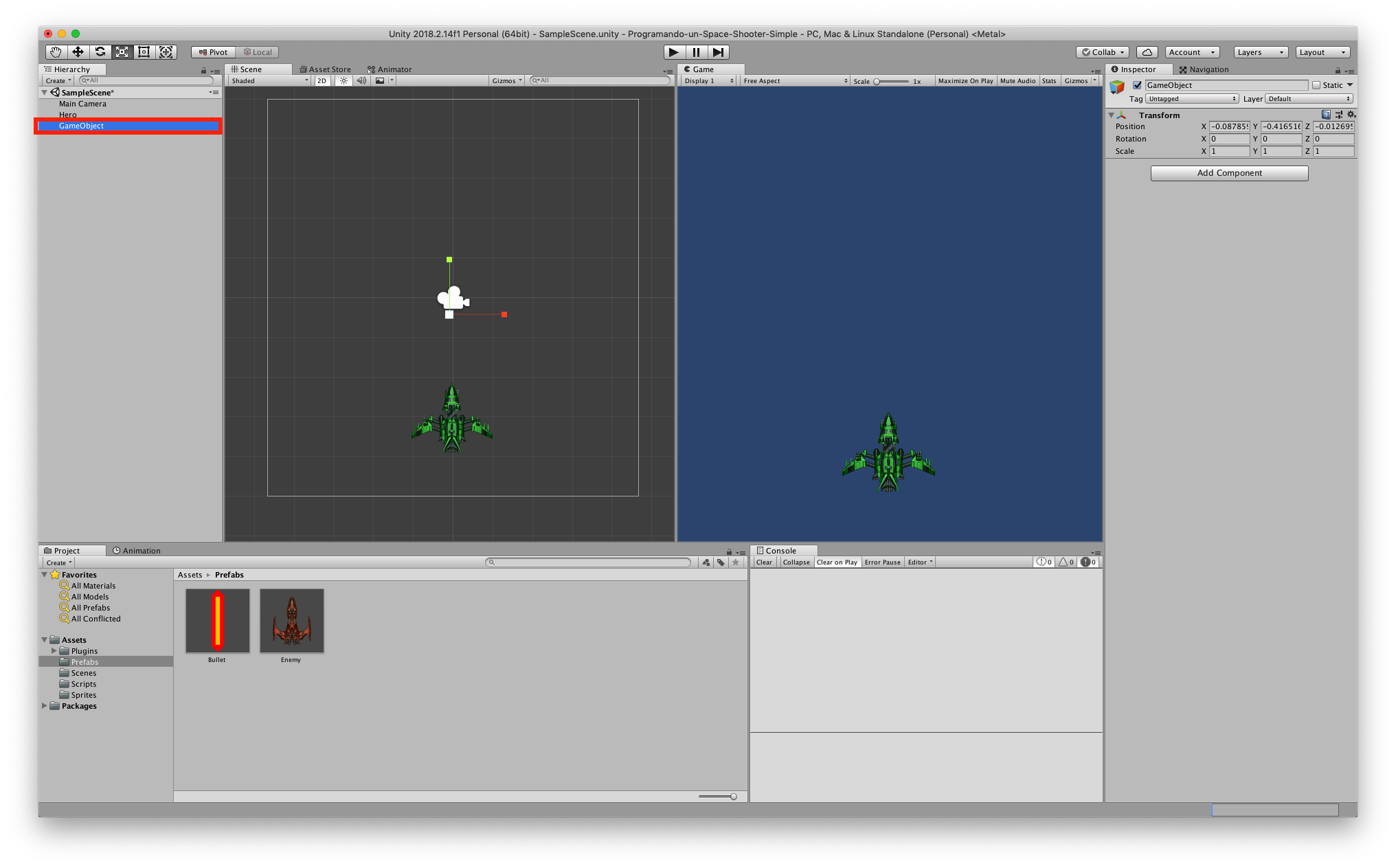 Ahora es momento de spanear enemigos. Ya sabemos spawnear bullets así que los enemigos no deberían ser muy diferentes. Vamos a preparar a un enemigo simple que, por el momento, sólo vaya hacia abajo. Si se animan ustedes, sería genial que lo hagan antes de seguir leyendo, ya que no es muy diferente a lo que habíamos hecho con la bullet.