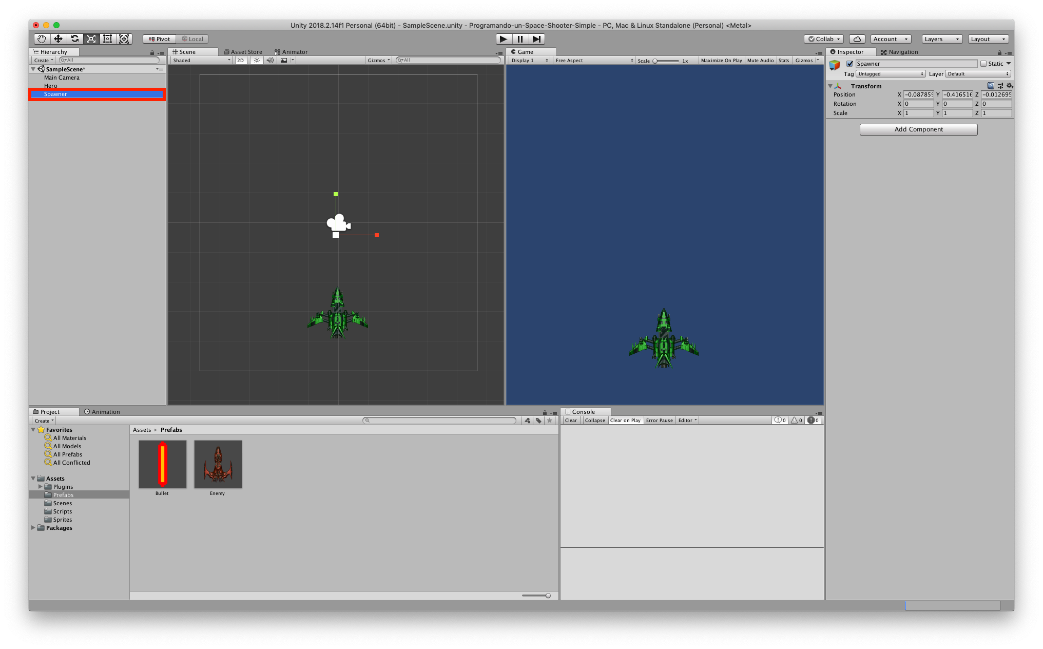 Si lo hicieron de la misma manera que yo, van a notar, al volver a Unity, que el script tira un error. Si directamente no pasó nada, chequeen si realmente arrastraron los scripts al spawner (suele pasar cuando empezamos con Unity que nos olvidemos estas cosas). Van a ver un error en la consola que dice algo como esto:
