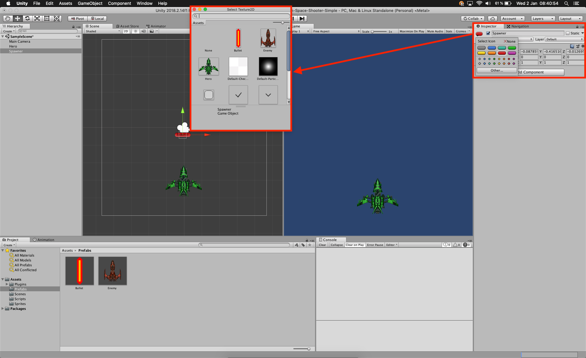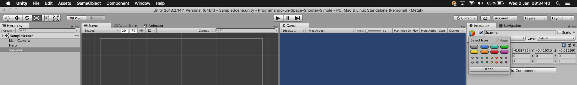 Como nuestro spawner no tiene ninguna imagen asociada, lo que podemos hacer es decirle a Unity que nos muestre un ícono sobre él, para poder encontrarlo con facilidad en el escenario. Para esto, seleccionamos el objeto y en la ventana “Inspector“, justo a la izquierda de su nombre, hacemos click y podemos elegir un ícono. Si no nos gusta ninguno de los predeterminados podemos usar también otro haciendo click en el botón “Other” y seleccionando otro del proyecto.